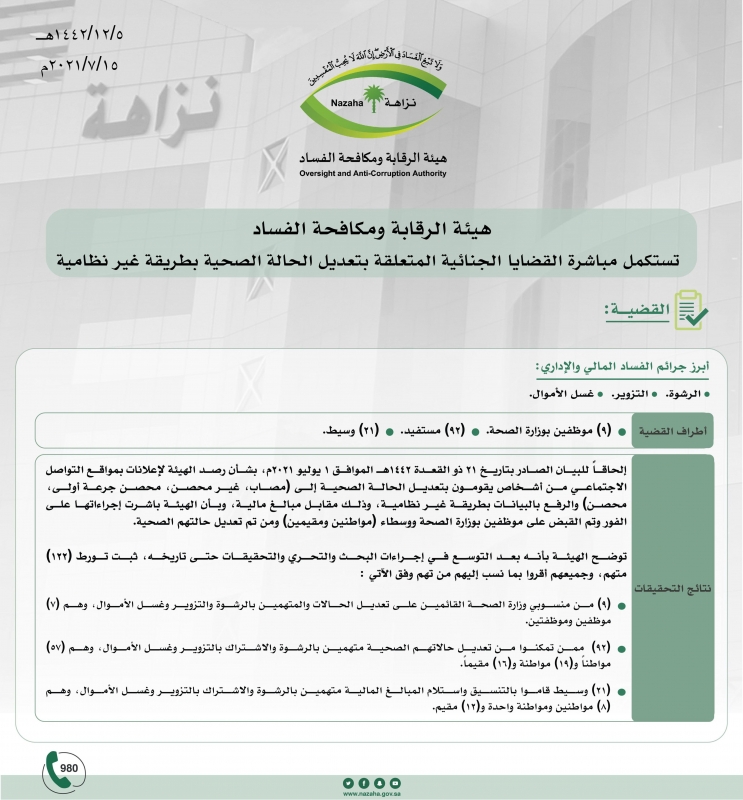 صرّح مصدر مسؤول في هيئة الرقابة ومكافحة الفساد بأنه إلحاقاً للبيان الصادر بتاريخ 21 ذي القعدة 1442هـ الموافق 1 يوليو 2021م، بشأن رصد الهيئة لإعلانات بمواقع التواصل الاجتماعي من أشخاص يقومون بتعديل الحالة الصحية إلى (مصاب، غير محصن، محصن جرعة أولى، محصن) والرفع بالبيانات بطريقة غير نظامية، وذلك مقابل مبالغ مالية، وبأن الهيئة باشرت إجراءاتها على الفور، وقُبض على موظفين بوزارة الصحة ووسطاء (مواطنين ومقيمين) ومن عُدلت حالتهم الصحية.