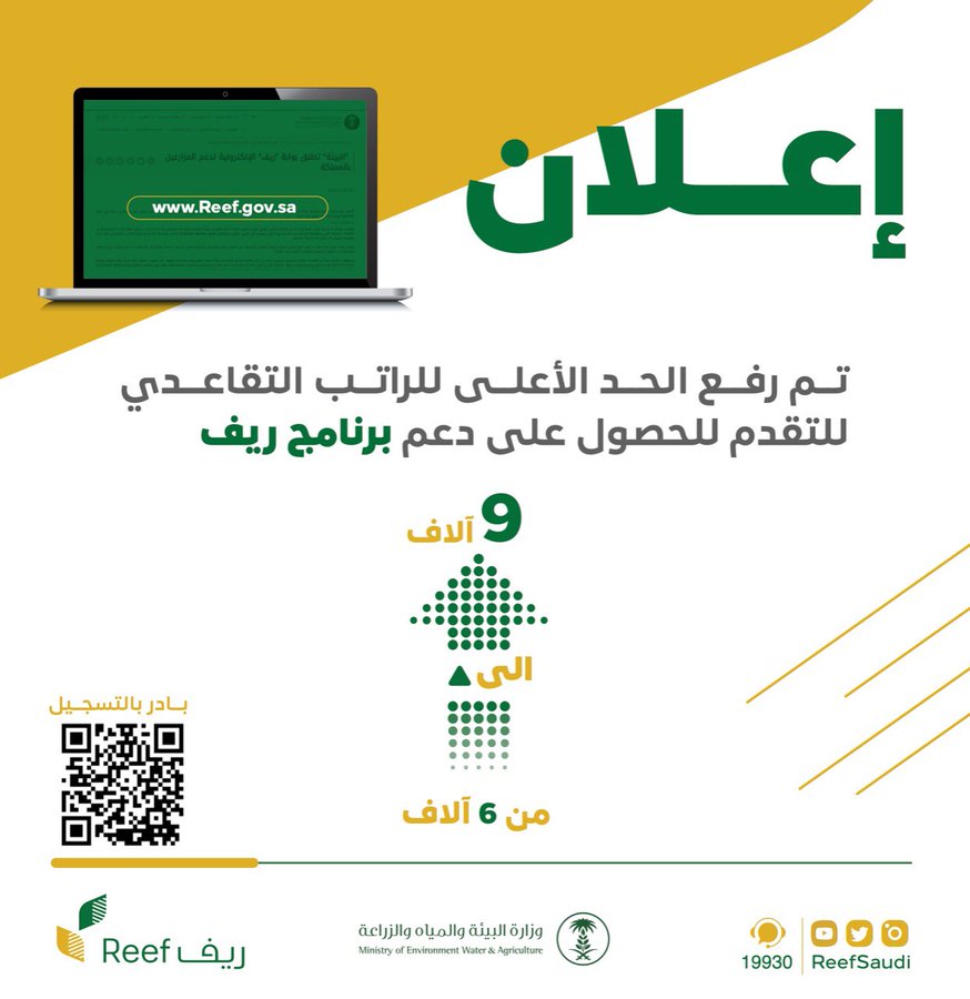 وقال البرنامج، في بيان له عبر “تويتر”: “برنامج ريف يعلن عن تخفيف القيد المانع للحد الأعلى للراتب التقاعدي للاستحقاق من 6 آلاف ريال إلى 9 آلاف ريال لزيادة عدد المستفيدين وتقديم المزيد من الدعم للمزارعين أبناء المملكة.