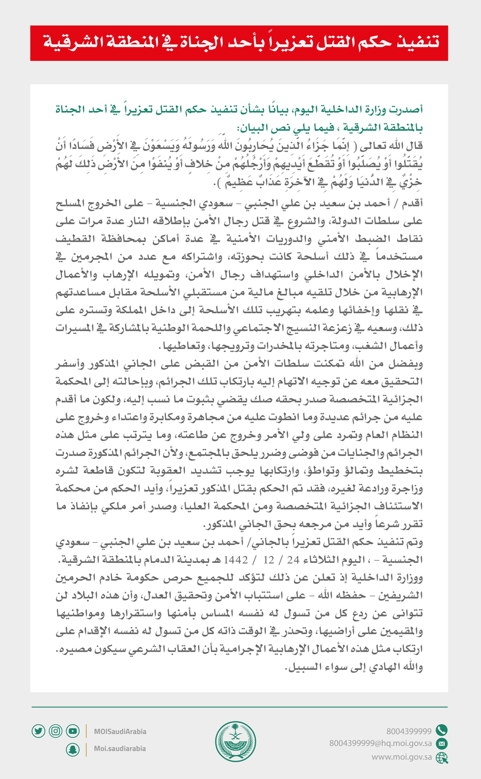 وبفضل من الله تمكنت سلطات الأمن من القبض على الجاني المذكور وأسفر التحقيق معه عن توجيه الاتهام إليه بارتكاب تلك الجرائم، وبإحالته إلى المحكمة الجزائية المتخصصة صدر بحقه صك يقضي بثبوت ما نسب إليه، ولكون ما أقدم عليه من جرائم عديدة وما انطوت عليه من مجاهرة ومكابرة واعتداء وخروج على النظام العام وتمرد على ولي الأمر وخروج عن طاعته، وما يترتب على مثل هذه الجرائم والجنايات من فوضى وضرر يلحق بالمجتمع، ولأن الجرائم المذكورة صدرت بتخطيط وتمالؤ وتواطؤ، وارتكابها يوجب تشديد العقوبة لتكون قاطعة لشره وزاجرة ورادعة لغيره، فقد تم الحكم بقتل المذكور تعزيراً، وأيد الحكم من محكمة الاستئناف الجزائية المتخصصة ومن المحكمة العليا، وصدر أمر ملكي بإنفاذ ما تقرر شرعاً وأيد من مرجعه بحق الجاني المذكور، وتم تنفيذ حكم القتل تعزيراً بالجانياليوم الثلاثاء بمدينة الدمام بالمنطقة الشرقية”.