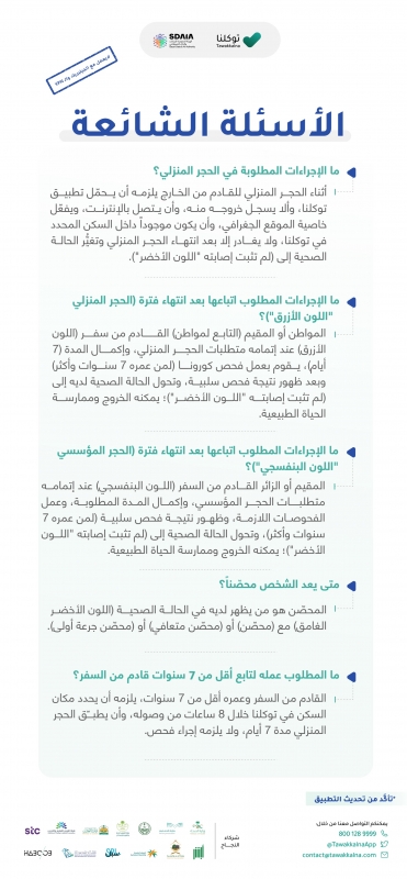 سلط تطبيق توكلنا الضوء على أبرز التساؤلات والإجابة عنها، ومن بينها الإجراءات المطلوبة في الحجر المنزلي والإجراءات المطلوب اتباعها بعد انتهاء الحجر المنزلي (اللون الأزرق).