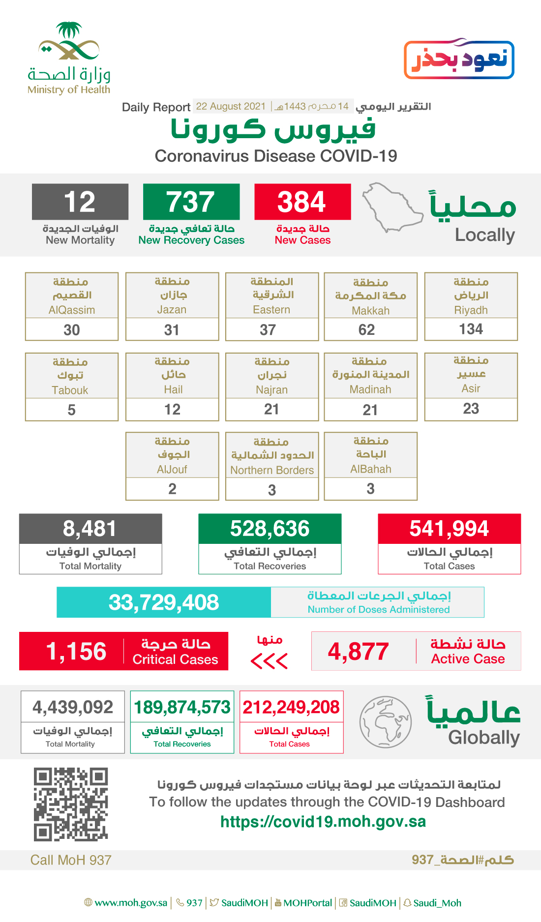 وكشفت الوزارة أن عدد الحالات النشطة بلغ 4877 والحالات الحرجة 1156 حالة.