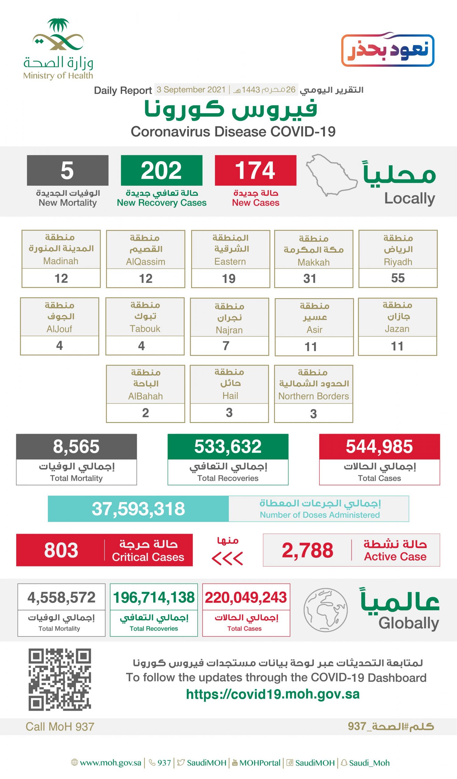وكشفت الوزارة أن عدد الحالات النشطة بلغ 2788 والحالات الحرجة 803 حالة.