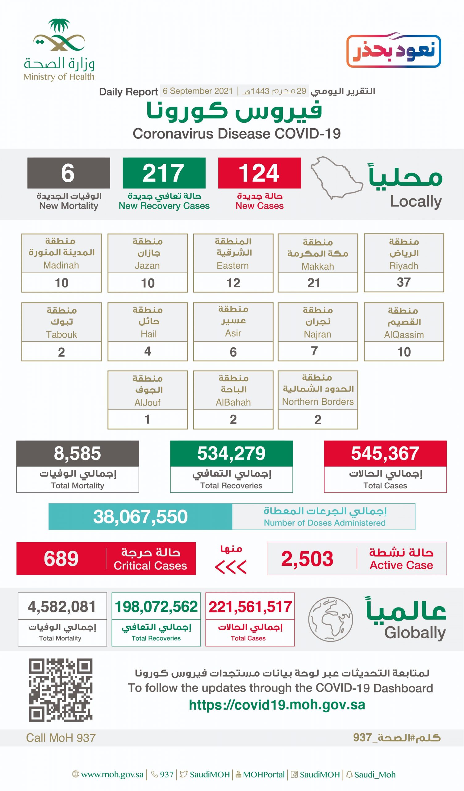 أعلنت وزارة الصحة، اليوم الاثنين 8 سبتمبر 2021، تسجيل 124 حالة إصابة جديدة بفيروس كورونا الجديد (كوفيد-19)، ليصبح الإجمالي 545367 حالة.