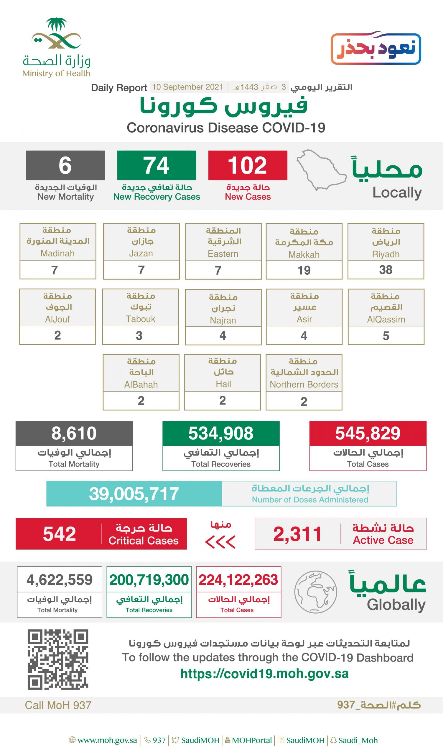 وكشفت الوزارة أن عدد الحالات النشطة بلغ 2311 والحالات الحرجة 542 حالة.