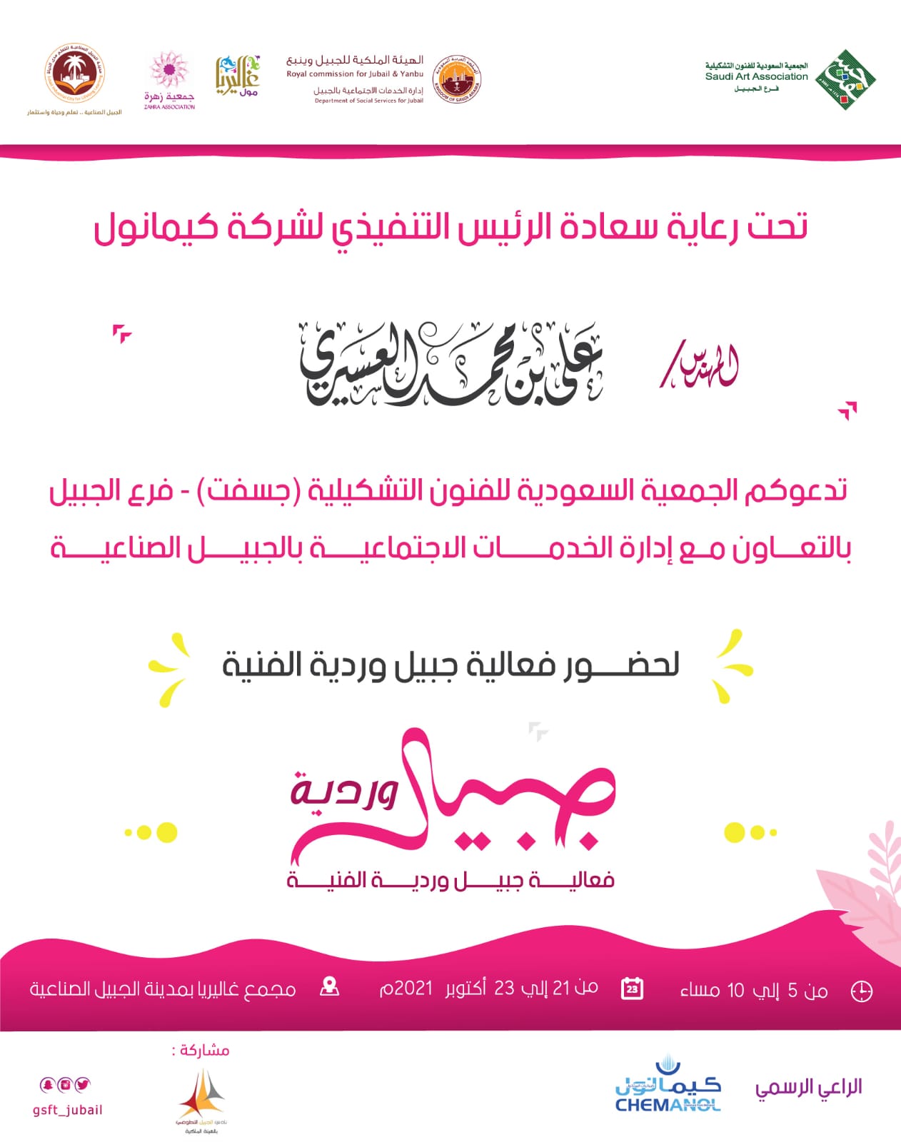 تطلق الجمعية السعودية للفنون التشكيلية “جسفت” فرع الجبيل، بالتعاون مع إدارة الخدمات الاجتماعية بالجبيل الصناعية، فعالية جبيل وردية الفنية، تحت رعاية سعادة الرئيس التنفيذي لشركة كيمانول المهندس علي بن محمد العسيري، وذلك في الفترة (21 – 23 أكتوبر 2021م، بمجمع غاليريا مول بمدينة الجبيل الصناعية.