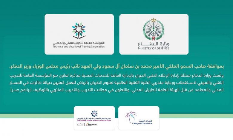 بناءً على موافقة صاحب السمو الملكي الأمير محمد بن سلمان بن عبد العزيز ولي العهد نائب رئيس مجلس الوزراء وزير الدفاع وقعت وزارة الدفاع ممثلة بإدارة الإخلاء الطبي الجوي بالإدارة العامة للخدمات الصحية أمس بالرياض مذكرة تعاون مع المؤسسة العامة للتدريب التقني والمهني لاستقطاب ورعاية متدربي الكلية التقنية العالمية لعلوم الطيران بالرياض للعمل كفنيين صيانة طائرات في المسار المدني والمعتمد من قبل الهيئة العامة للطيران المدني، والتعاون في مجالات التدريب والتدريب المنتهي بالتوظيف (برنامج جسر).