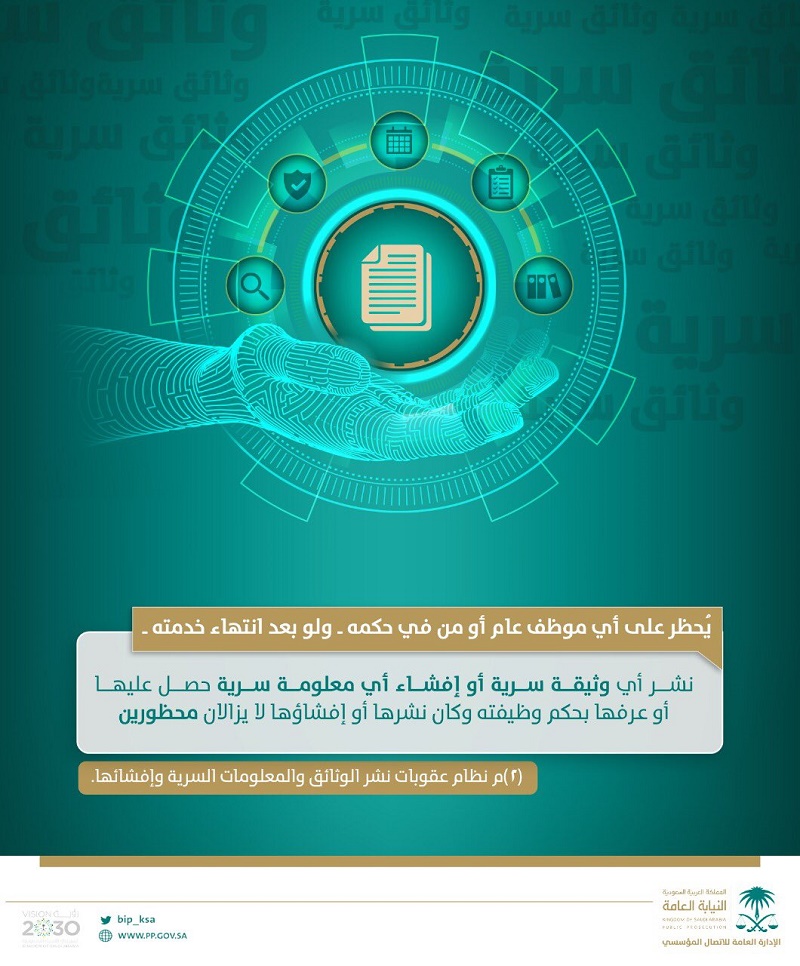 قالت النيابة العامة إن نشر الوثائق والمعلومات السرية أو إفشاء أي منها جريمة، يعاقب مرتكبها وكل من اشترك فيها بالعقوبات المقرّرة لها، ويُعد شريكاً في الجريمة كل من اتفق أو حرض أو ساعد على ارتكابها مع علمه بذلك إذا ارتكبت الجريمة بناء على هذا الاتفاق أو التحريض أو المساعدة.