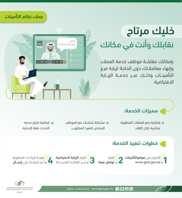 وتأتي هذه الخدمة امتداداً لحرص ” التأمينات الاجتماعية” على تمّكين العملاء من تنفيذ الخدمات والمعاملات إلكترونياً عبر بوابة الخدمات الإلكترونية والتطبيق، وفي حال الحاجة إلى زيارة أحد فروع ومكاتب المؤسسة فإنه يمكن للعميل الاستفادة من ” الزيارة الافتراضية” والتواصل مع موظف خدمة العملاء بالصوت والصورة، ومشاركة الشاشة ورفع الملفات المطلوبة مباشرة خلال اللقاء، وإنهاء المعاملات والخدمات المختارة.