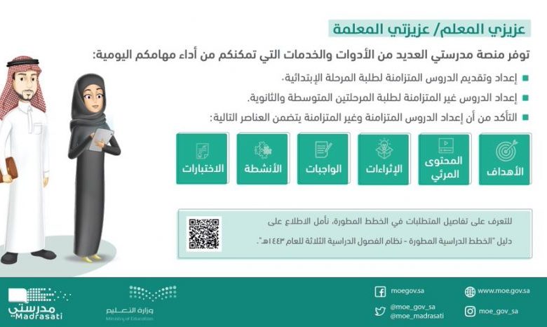 وأضافت منصة مدرستي، أنه يمكن الحصول على المزيد من المعلومات من خلال زيارة منصة العودة للمدارس من خلال الرابط التالي: https://backtoschool.sa/n/page/teachers.html