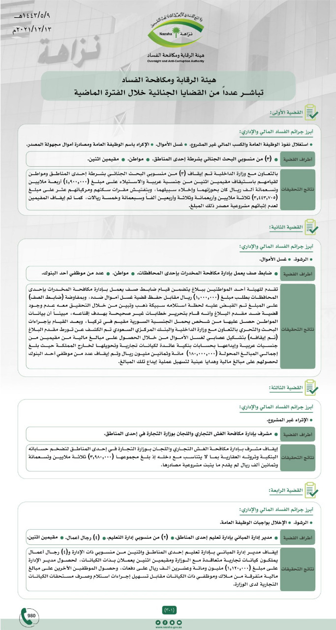 القضية الثانية: تقدم للهيئة أحد المواطنين ببلاغ يتضمن قيام ضابط صفّ يعمل بإدارة مكافحة المخدرات بإحدى المحافظات بطلب مبلغ (1.000.000) مليون ريال مقابل حفظ قضية غسل أموال ضده، وبمفاوضة (ضابط الصفّ) على المبلغ تم القبض عليه لحظة استلامه سبيكة ذهب، وتبين من خلال التحقيق معه عدم وجود قضية ضد مقدم البلاغ وأنه قام بتحرير خطابات غير صحيحة بهدف إقناعه، مبيناً أن بيانات المواطن حصل عليها من شخص يحمل الجنسية السورية مقيم في تركيا، وبعد القيام بإجراءات البحث والتحري بالتعاون مع وزارة الداخلية والبنك المركزي السعودي تم الكشف عن تورط مقدم البلاغ (تم إيقافه) بتشكيل عصابي لغسل الأموال من خلال الحصول على مبالغ مالية من مقيمين من جنسيات عربية وإيداعها بحسابات بنكية عائدة لكيانات تجارية وتحويلها لخارج المملكة،حيث بلغ إجمالي المبالغ المُحوَّلة (180.000.000) مئة وثمانين مليون ريال، وتم إيقاف عدد من موظفي أحد البنوك لحصولهم على مبالغ مالية وهدايا عينية؛ لتسهيل عملية إيداع تلك المبالغ.
