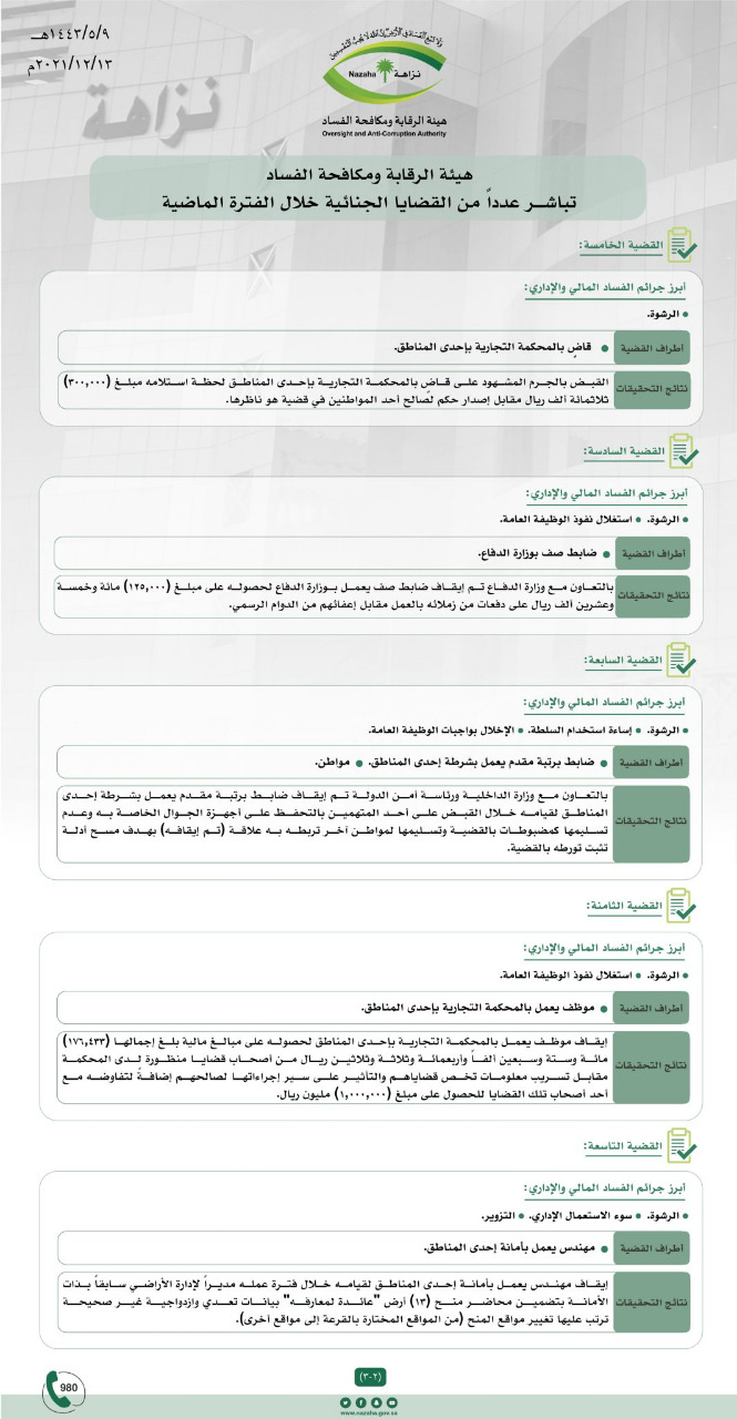 القضية الثامنة: إيقاف موظف يعمل بالمحكمة التجارية بإحدى المناطق؛لحصوله على مبالغ مالية بلغ إجماليها (176.433) مئة وستة وسبعين ألفاً وأربع مئة وثلاثة وثلاثين ريالاً من أصحاب قضايا منظورة لدى المحكمة مقابل تسريب معلومات تخصّ قضاياهم، والتأثير على سير إجراءاتها لصالحهم، إضافةً إلى تفاوضه مع أحد أصحاب تلك القضايا للحصول على مبلغ (1.000.000) مليون ريال.