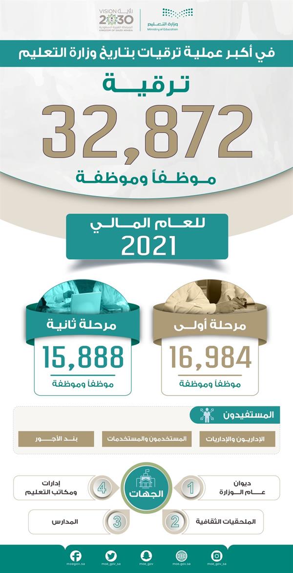 وبذلك يرتفع عدد الموظفين والموظفات الذين تمت ترقيتهم بوزارة التعليم خلال العام المالي 2021 إلى نحو 33 ألف موظف وموظفة، وذلك في أكبر عدد ترقيات خلال عام واحد في تاريخ الوزارة.