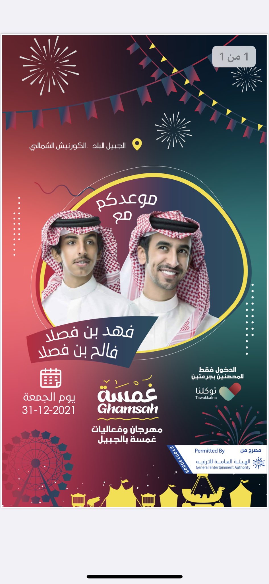 وقد أعلن حساب المهرجان عن حضور فهد بن فصلا و فالح بن فصلا ليوم الجمعة الموافق 31 ديسمبر 2021م ، كما حرصت إدارة المهرجان على التنبيه بالتقيد بالإجراءات الوقائية الصحية، وسوف يكون الدخول فقط للمحصنين بجرعتين، وإبراز تطبيق توكلنا.