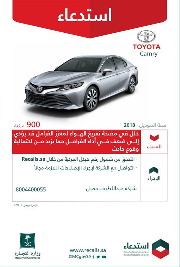 استدعت وزارة التجارة، 900 مركبة، “تويوتا كامري”، لخلل في مضحة بالفرامل قد يزيد احتمالية وقوع الحوادث :