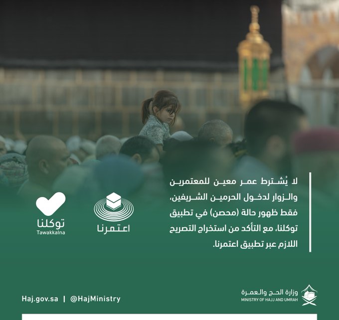 أعلنت وزارة الحج والعمرة اليوم أنه لا يشترط عمر معين للمعتمرين والزوار لدخول الحرمين الشريفين فقط ظهور حالة ” محصن ) من تطبيق توكلنا ، مع التأكد لاستخراج التصريح اللازم عبر تطبيق اعتمرنا.