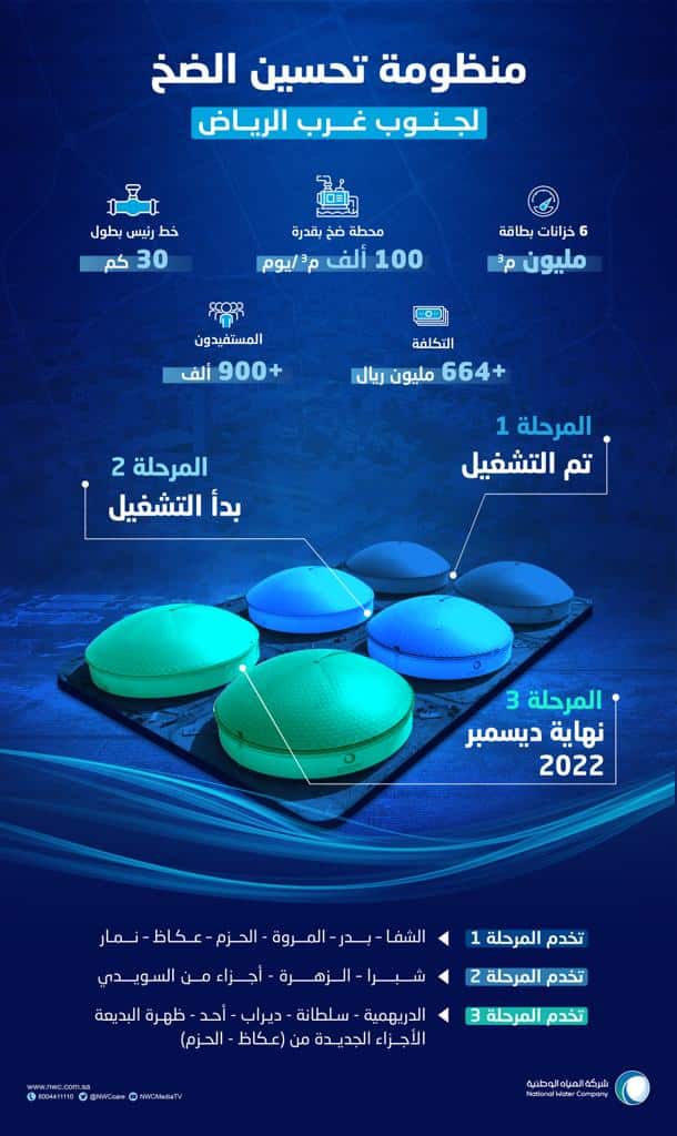 وأوضحت الشركة أن مشروع منظومة تحسين الضخ لجنوب غرب الرياض تضمنت تشيّيد 6 خزانات بسعة تصميمة تبلغ مليون متر مكعب، وخط رئيسي بطول 30 كلم، ومحطة ضخ بقدرة 100 ألف متر مكعب في اليوم، مبينة أنها أعلنت في وقت سابق تشغيلها المرحلة الأولى من المشروع لخدمة أحياء الشفا وبدر والمروة، وأجزاء من الحزم وعكاظ ونمار، وانتقالها من جدول الضخ المتقطع إلى الضخ المستمر.