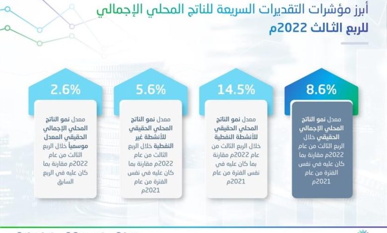 أظهرت بيانات الهيئة العامة للإحصاء أن الناتج المحلي الإجمالي الحقيقي للمملكة، ارتفع بنسبة 8.6% في الربع الثالث 2022 مقارنة بنفس الفترة من عام 2021، وذلك وفقًا للتقديرات السريعة التى أجرتها الهيئة.
