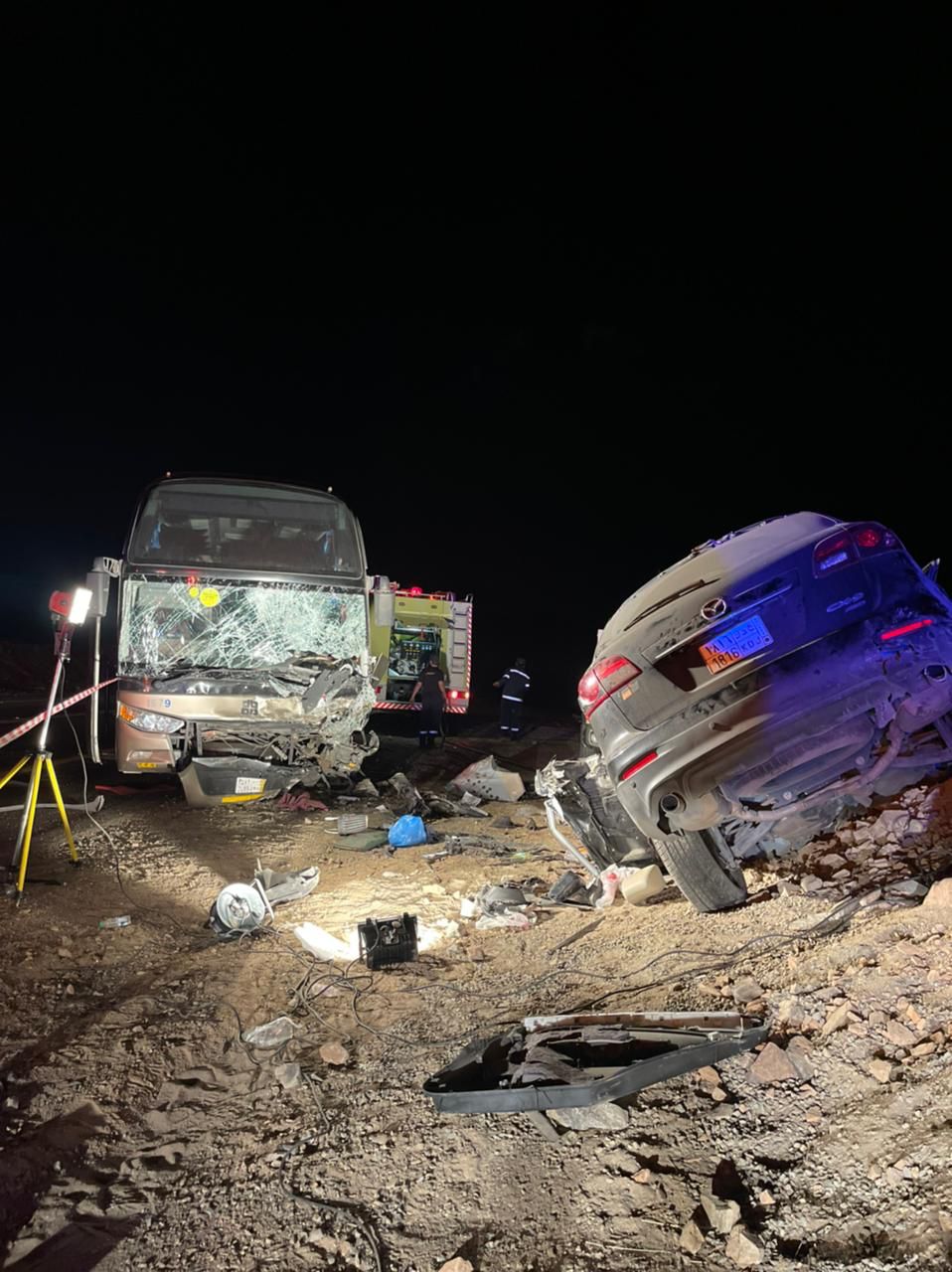 و تم توجيه اربع فرق اسعافيه من الهلال الأحمر للموقع والقائد الميداني حسب البلاغ الوارد وعند وصول اول فرقه للموقع تبين سبع إصابات بالموقع تم التعامل حسب البرتكول الاسعافي تم نقل اربع إصابات خطيره واصابه رفضت النقل وحالتين وفاه بالموقع نسال الله الشفاء العاجل للمصابين والرحمة والمغفرة للمتوفين .