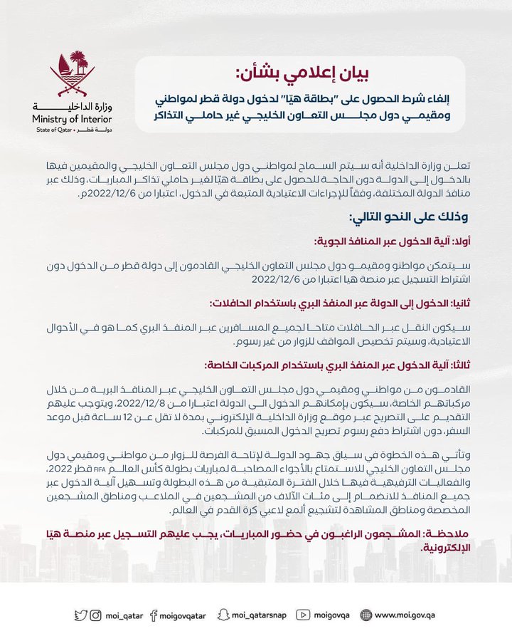 أعلنت وزارة الداخلية القطرية، اليوم (الثلاثاء)، السماح لمواطني ومقيمي دول مجلس التعاون الخليجي غير حاملي تذاكر المونديال، بالدخول إلى قطر عبر منافذها المختلفة، دون الحاجة إلى بطاقة “هيا”، اعتبارا من اليوم.