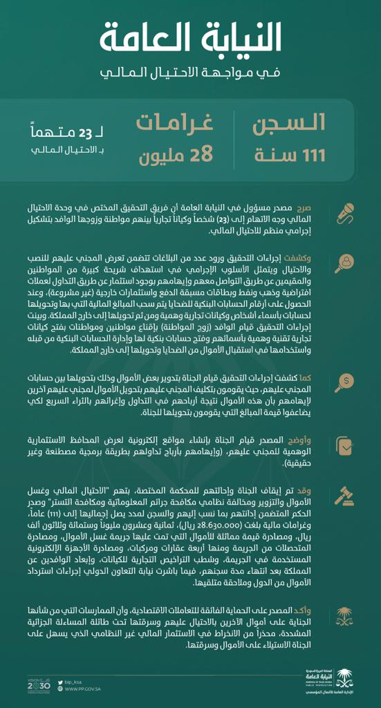 وقد تم إيقاف الجناة وإحالتهم للمحكمة المختصة، بتهم “الاحتيال المالي وغسل الأموال والتزوير ومخالفة نظامي مكافحة جرائم المعلوماتية ومكافحة التستر” وصدر الحكم المتضمن إدانتهم بما نسب إليهم والسجن لمدد يصل إجماليها إلى (111) عاماً، وغرامات مالية بلغت (28.630.000 ريال)، ثمانية وعشرون مليوناً وستمائة وثلاثون ألف ريال، ومصادرة قيمة مماثلة للأموال التي تمت عليها جريمة غسل الأموال، ومصادرة المتحصلات من الجريمة ومنها أربعة عقارات ومركبات، ومصادرة الأجهزة الإلكترونية المستخدمة في الجريمة، وشطب التراخيص التجارية للكيانات، وإبعاد الوافدين عن المملكة بعد انتهاء مدة سجنهم، فيما باشرت نيابة التعاون الدولي إجراءات استرداد الأموال من الدول وملاحقة متلقيها.