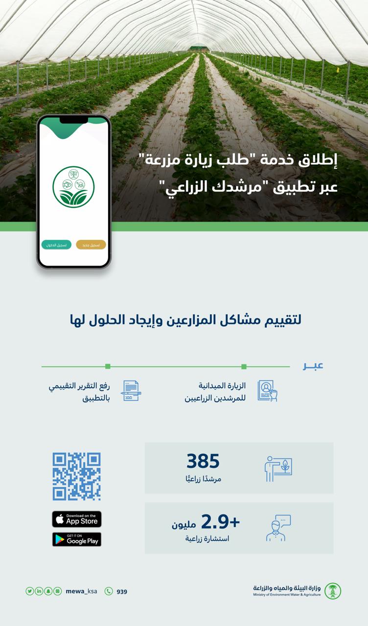 أطلقت وزارة البيئة والمياه والزراعة، خدمة جديدة عبر تطبيق “مرشدك الزراعي” على الأجهزة الذكية، وهي خدمة “طلب زيارة مزرعة”؛ التي تتيح للمستفيدين من المزارعين والمستثمرين، طلب زيارة المرشدين الزراعيين التابعين للمنطقة لمزارعهم؛ لتقييم أي مشكلة تواجههم وتقديم الحلول لها.
