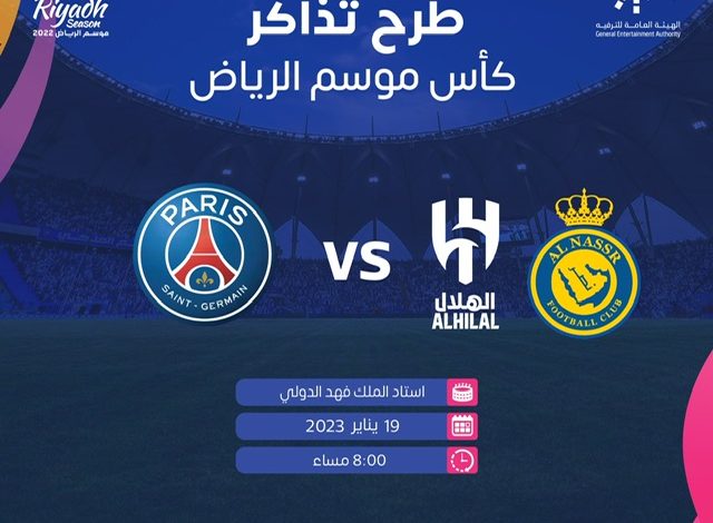 يشهد الطلب على تذاكر مباراة الأحلام بين فريق باريس سان جيرمان الفرنسي ونجوم نادي الهلال والنصر على كأس موسم الرياض إقبالاً غير مسبوق لأكثر من 2 مليون طلب، وذلك بعد ساعات قليلة من طرح تذاكر المباراة التي ستجرى يوم 19 يناير، على استاد الملك فهد الدولي، الذي يتسع لنحو 70 ألف متفرج.