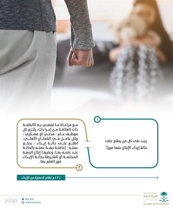 وأوضحت النيابة العامة أنه عملاً بمقتضى المادة 3 من نظام الحماية من الإيذاء؛ يلتزم الموظفون والعاملون بالقطاع الأهلي بحكم عملهم بإحاطة جهة العمل بالحالة عند علمهم بها، وعليها إبلاغ الجهة المختصة أو الشرطة بحالة الإيذاء فور العلم بها.