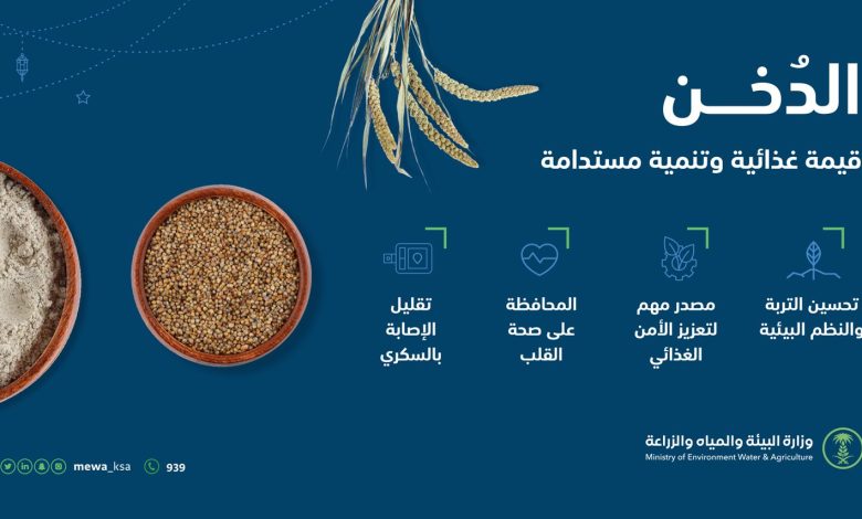 وتعظيمًا للفائدة الغذائية الكبيرة للدخن، وإسهامه في تحقيق الأمن الغذائي؛ شاركت الوزارة مؤخرًا في الاحتفال بإطلاق السنة الدولية للدخن، حيث أعلنت الجمعية العامة للأمم المتحدة العام (2023م) سنةً دولية للدخن، تحت شعار “إرث غني لطاقة كاملة”؛ بهدف إبراز مزايا الدخن ورفع مستوى الوعي به، فضلًا عن توجيه السياسات للاستفادة من منافعه الغذائية والصحية.