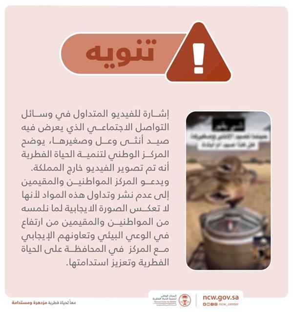 نوّه المركز الوطني لتنمية الحياة الفطرية، بأن الفيديو المتداول في وسائل التواصل الاجتماعي الذي يُعرض فيه صيد أنثى وَعْل وصغيرها تم تصويره خارج المملكة.