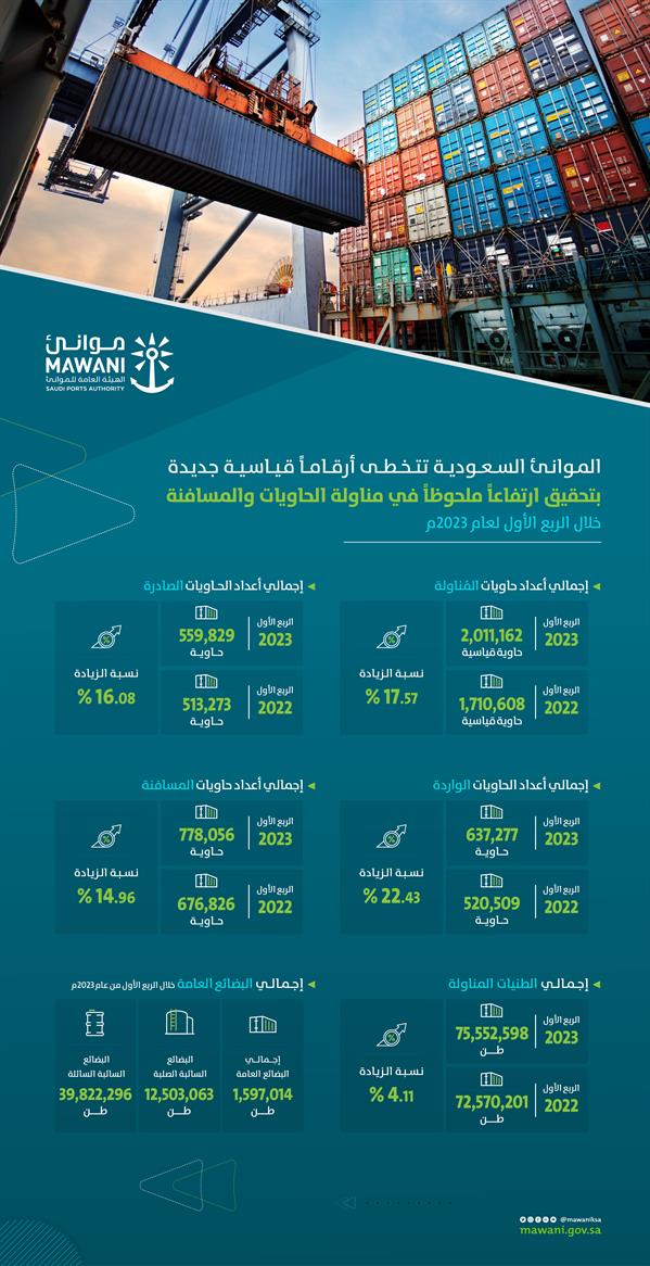 أعلنت الهيئة العامة للموانئ “موانئ” ارتفاع أعداد حاويات المُناولة في الموانئ التابعة لها خلال الربع الأول لعام 2023 بنسبة 17.57% لتصل إلى 2.01 مليون حاوية قياسية مقارنة بـ 1.71 مليون حاوية في الربع المقابل من عام 2022م.