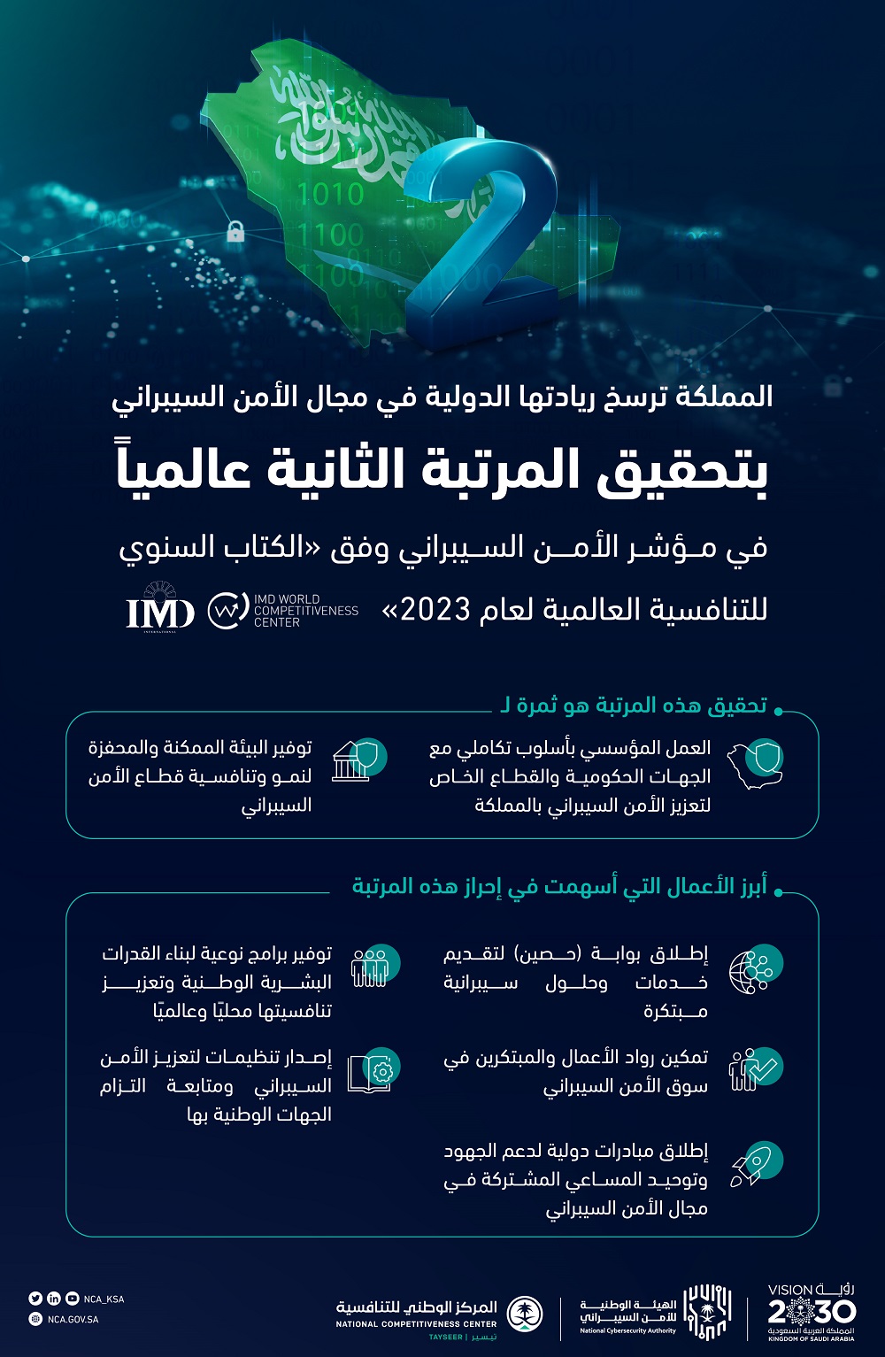 حققت المملكة العربية السعودية المرتبة الثانية عالمياً في مؤشر الأمن السيبراني وذلك ضمن تقرير الكتاب السنوي للتنافسية العالمية لعام 2023 الصادر عن مركز التنافسية العالمي التابع للمعهد الدولي للتنمية الإدارية في سويسرا IMD، والذي يهدف إلى تحليل وترتيب قدرة الدول على إيجاد بيئة داعمة ومحفزة للتنافسية والمحافظة عليها وتطويرها.