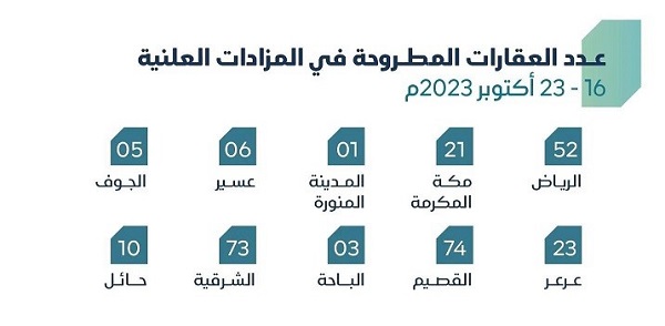 وأوضح المركز أن المزادات تتضمن إقامة 4 مزادات في منطقة مكة المكرمة لعرض 21 فرصة عقارية متنوعة، و7 مزادات لعرض 52 عقارًا بمنطقة الرياض، و73 عقارًا بمنطقة الشرقية من خلال 5 مزادات علنية، و74 فرصة عقارية في 4 مزادات بمنطقة القصيم، ومزادًا واحدًا في منطقة الجوف يعرض فيه 5 عقارات، إضافةً لعرض 23 عقارًا بعرعر، و10 عقارات بمنطقة حائل، و3 عقارات في منطقة الباحة، و6 عقارات في منطقة عسير، ومزادًا بالمدينة المنورة يعرض من خلاله قصر سكني، إلى جانب إقامة عدة مزادات على مجموعة من المنقولات، وذلك بإقامة مزاد الإبل بالطويقي بمدينة الرياض، ومزاد الإبل والأغنام بالمدينة المنورة، ومزاد للسيارات والشاحنات بجدة.