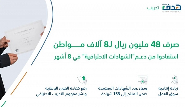 هدف : صرف 48 مليون ريال لـ 8 آلاف مواطن استفادوا من دعم الشهادات الاحترافية في 8 أشهر