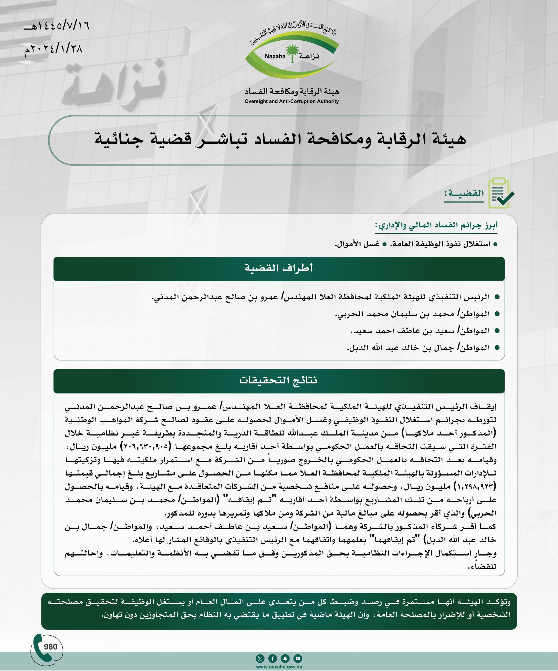 صرّح مصدر مسؤول في #هيئة_الرقابة_ومكافحة_الفساد بأنه تم إيقاف الرئيس التنفيذي للهيئة الملكية لمحافظة العلا المهندس/ عمرو بن صالح عبدالرحمن المدني، لتورطه بجرائم استغلال النفوذ الوظيفي وغسل الأموال لحصوله على عقود لصالح شركة المواهب الوطنية (المذكور أحد ملاكها) من مدينة الملك عبدالله للطاقة الذرية والمتجددة بطريقة غير نظامية خلال الفترة التي سبقت التحاقه بالعمل الحكومي بواسطة أحد أقاربه بلغ مجموعها (206,630,905) مليون ريال، وقيامه بعد التحاقه بالعمل الحكومي بالخروج صورياً من الشركة مع استمرار ملكيته فيها وتزكيتها للإدارات المسؤولة بالهيئة الملكية لمحافظة العلا مما مكنها من الحصول على مشاريع بلغ إجمالي قيمتها (1,298,923) مليون ريال، وحصوله على منافع شخصية من الشركات المتعاقدة مع الهيئة، وقيامه بالحصول على أرباحه من تلك المشاريع بواسطة أحد أقاربه “تم إيقافه” (المواطن/ محمد بن سليمان محمد الحربي) والذي أقر بحصوله على مبالغ مالية من الشركة ومن ملاكها وتمريرها بدوره للمذكور. كما أقر شركاء المذكور بالشركة وهما (المواطن/ سعيد بن عاطف أحمد سعيد، والمواطن/ جمال بن خالد عبد الله الدبل) “تم إيقافهما” بعلمهما واتفاقهما مع الرئيس التنفيذي بالوقائع المشار لها أعلاه. وجارٍ استكمال الإجراءات النظامية بحق المذكورين وفق ما تقضي به الأنظمة والتعليمات، وإحالتهم للقضاء.