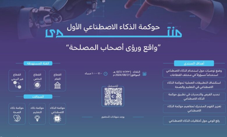 تطلق جمعية حوكمة الذكاء الاصطناعي أول منتدى من نوعه في المنطقة عن ” حوكمة الذكاء الاصطناعي ” وذلك يوم 27 8 / 2024 م افتراضيا عبر برنامج الزووم . وصرحت رئيسة مجلس إدارة جمعية حوكمة الذكاء الاصطناعي الدكتورة ظبيه البوعينين أن المنتدى يعتبر الأول من نوعه في المنطقة ويهدف إلى زيادة المعرفة في مفاهيم حوكمة الذكاء الاصطناعي ورفع الوعي حول أخلاقيات الذكاء الاصطناعي وكذلك مناقشة التطبيقات العملية لحوكمة الذكاء الاصطناعي في التعليم والصحة وتحديد الفرص والتحديات في تطبيق حوكمة الذكاء الاصطناعي ووضع توصيات حول استخدام الذكاء الاصطناعي إستخداماً مسؤولاً في مختلف القطاعات، وأضافت البوعينين أن المنتدى يستهدف القطاعات الثلاثة، القطاع العام والخاص و غير الربحي مؤكدة أن مجالات المنتدى هي حوكمة الذكاء الاصطناعي بشكل عام وحوكمة ذكاء التعليم وحوكمة الصحة , ودعت البوعينين المهتمين في جميع القطاعات للمشاركة والتسجيل في المنتدى من خلال رابط التسجيل الرسمي للمنتدى :
