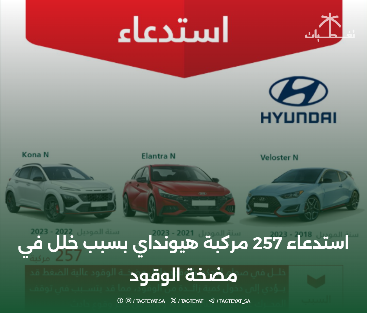 أعلنت وزارة التجارة عن استدعاء 257 سيارة هيونداي طرازات “كونا N” و”إلنترا N” و”فيلوستر N” المنتجة بين عامي 2018 و2023، وذلك لوجود خلل فني في صمام التحكم في الوقود بمضخة الوقود عالية الضغط.