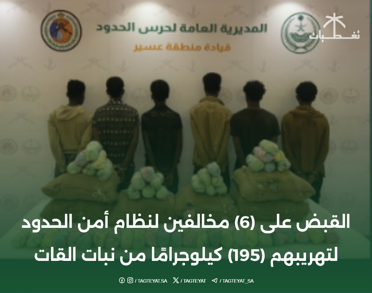 ألقت دورية حرس الحدود البرية بمديرية حات بمنطقة جازان القبض على 6 مشتبه بهم من الجنسية اليمنية مخالفين لنظام أمن الحدود بتهمة تهريب (195 كجم) من مادة القات المخدرة. وقد تم استكمال الإجراءات النظامية الأولية وتسليم المشتبه بهم والمضبوطات للجهات المختصة.