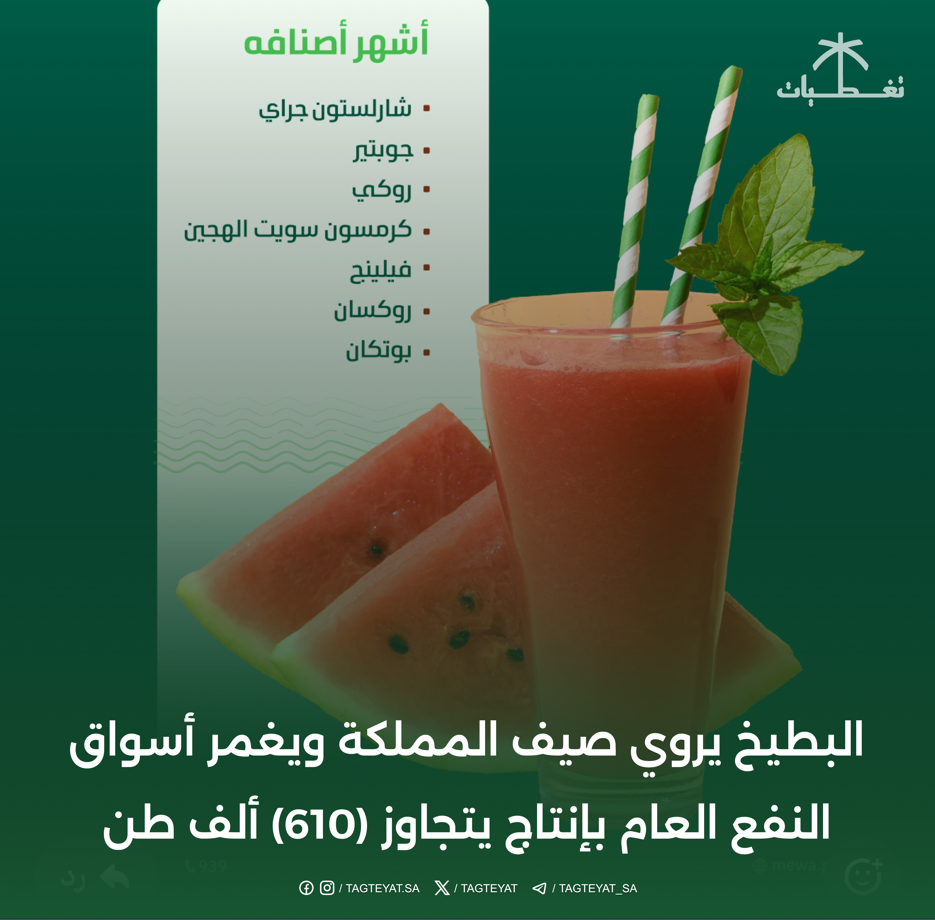 استقبلت مناطق المملكة في شهر يوليو الموسم الزراعي لحصاد فاكهة الصيف، حيث تجاوزت كمية البطيخ (613 ألف طن، وهو من أكثر الفواكه الصيفية رواجًا في الأسواق العامة، ويحظى بإقبال كبير من المستهلكين، بفضل نكهته الطبيعية وقيمته الغذائية الغنية ودوره المهم في صناعة التجهيز.