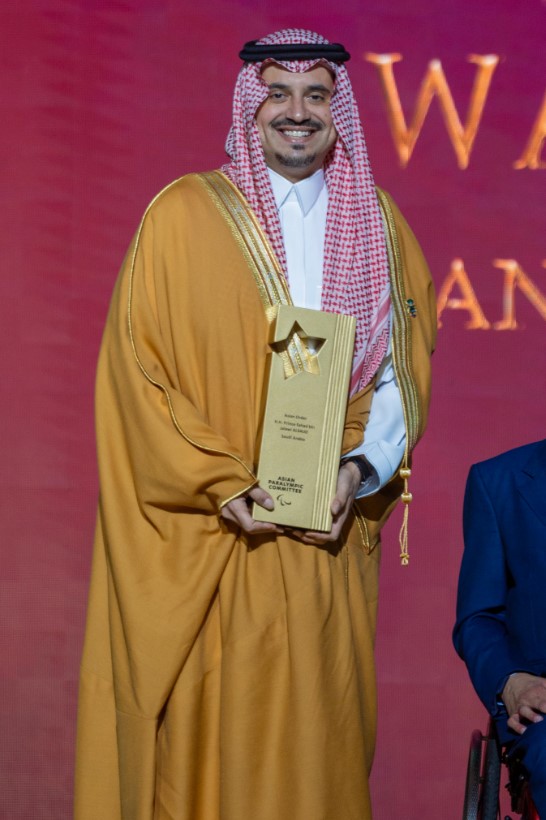كرّمت اللجنة البارالمبية الآسيوية صاحب السمو الأمير فهد بن جلوي بن عبدالعزيز بن مساعد، نائب رئيس اللجنة الأولمبية والبارالمبية السعودية، بوسام آسيا البارالمبي 2025 (Paralympic Asian Award 2025)، وذلك خلال حفل جوائز آسيا البارالمبية المقام على هامش مؤتمر الجمعية العمومية للجنة في العاصمة الكازاخستانية أستانا، تقديراً لجهوده وإسهاماته البارزة في تطوير رياضات ذوي الإعاقة ودعمه المستمر للحركة البارالمبية على المستويين الإقليمي والدولي بحضور رئيس اللجنة البارالمبية الدولية السيد اندرو بارسن.
