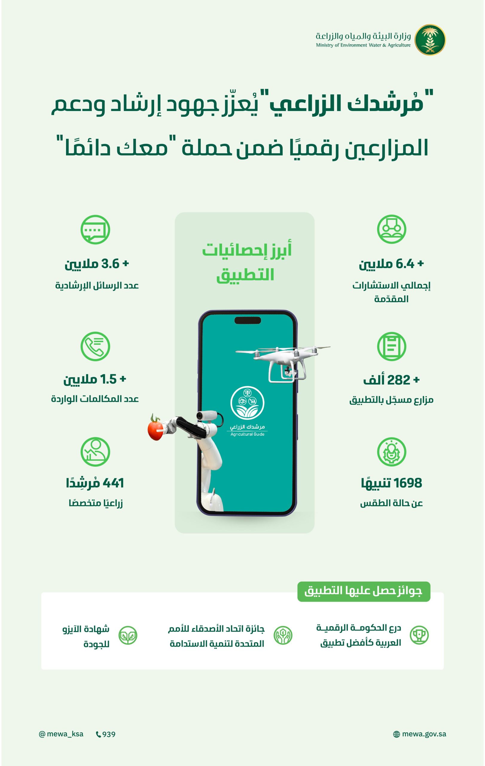 وأشارت الوزارة، إلى أن تطبيق “مرشدك الزراعي”، حقق العديد من المنجزات والجوائز منذ إطلاقه، وتميز كواحد من أفضل التطبيقات الرقمية الخدمية في المنطقة؛ حيث حصل التطبيق على عدة جوائز، أبرزها، درع الحكومة الرقمية العربية كأفضل تطبيقٍ عربي، وجائزة اتحاد الأصدقاء للأمم المتحدة لتنمية الاستدامة، إضافةً إلى شهادة الآيزو للجودة، كما حقق التطبيق أرقامًا قياسية، من أبرزها تقديم أكثر من (6,4) ملايين استشارة فنية للمزارعين، كما تجاوز عدد المزارعين المسجلين في التطبيق (282) ألف مزارع، إلى جانب (441) مرشدًا متخصصًا، مبينةً أن التطبيق وردت إليه خلال الفترة المذكورة، أكثر من (1,5) مليون مكالمة صوتية، فيما تجاوز إجمالي عدد الرسائل النصية الإرشادية (3,6) ملايين رسالة، وبلغ عدد الاستشارات المقدمة لقسم اسأل عن نبات وآفة، أكثر من مليون استشارة، فيما قدّم التطبيق للمزارعين نحو (1700) تنبيهًا عن حالة الطقس بحسب ما يعلن من المركز الوطني للأرصاد، و(687) حلقة بث مباشر إرشادية، إضافةً إلى (7945) خبرًا ومحتوىً إرشاديًا منشورًا، و(337) تحليلًا للتربة والمياه.