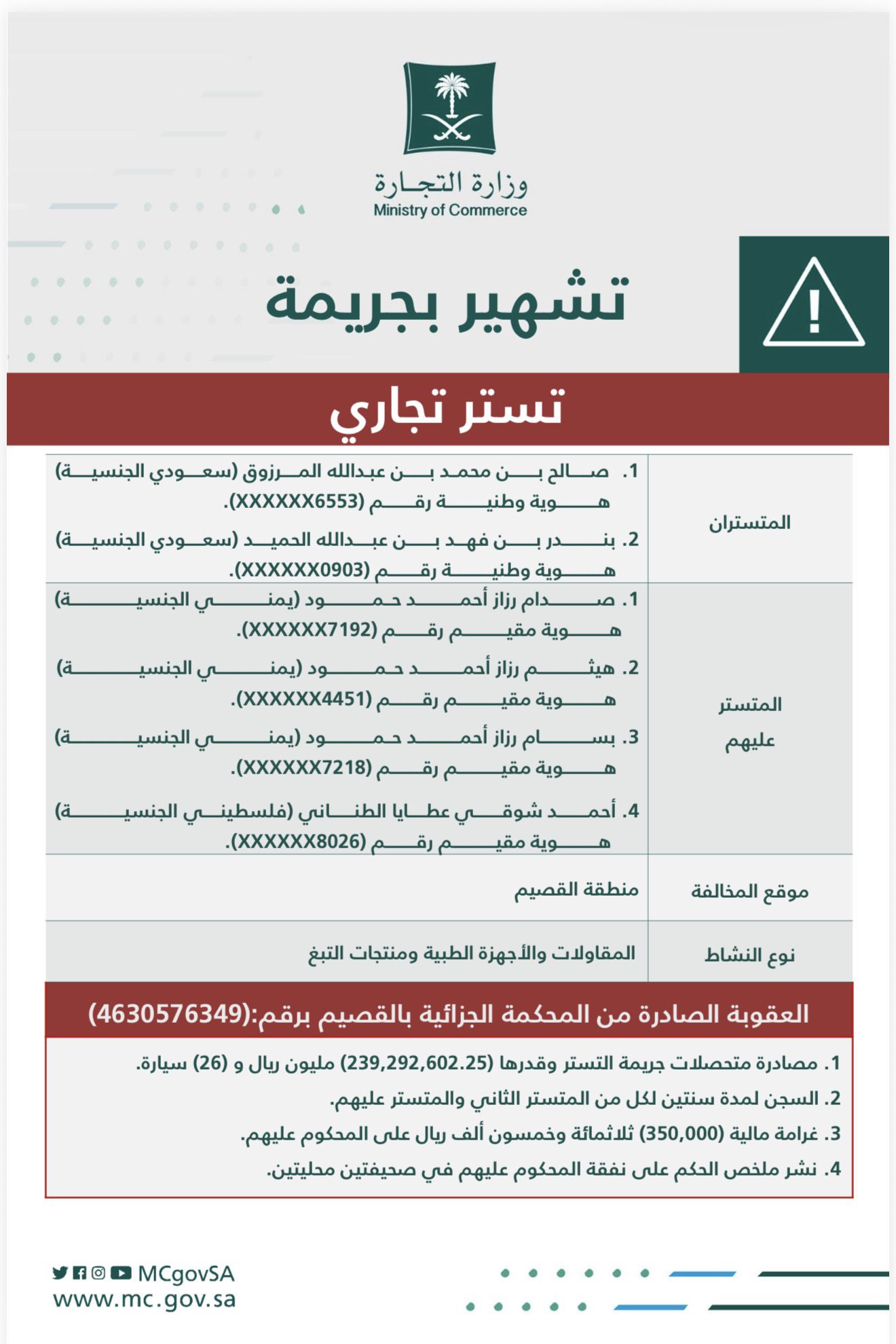 شهّرت وزارة التجارة بمواطنين اثنين و 4 مقيمين من الجنسيتين اليمنية والفلسطينية؛ لتورطهم في جريمة تستر تجاري في قطاعات المقاولات والأجهزة الطبية ومنتجات التبغ بمنطقة القصيم.