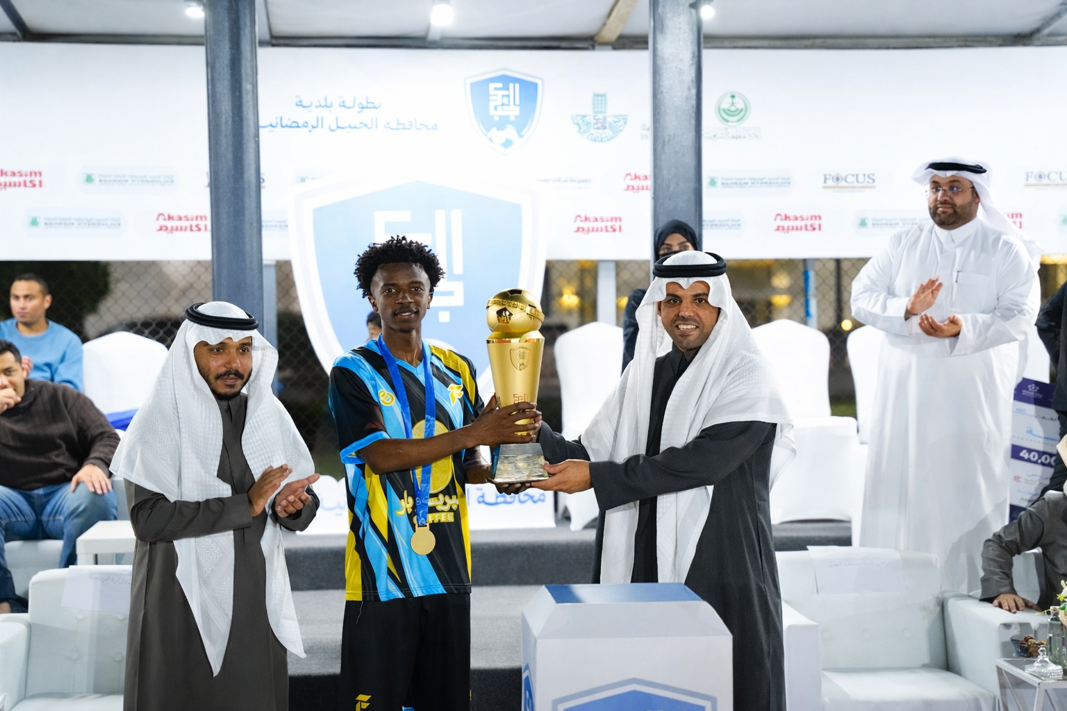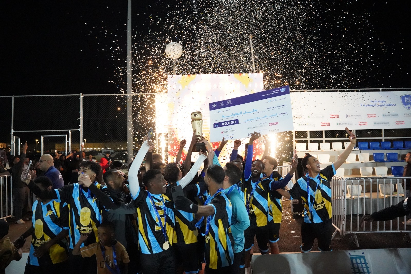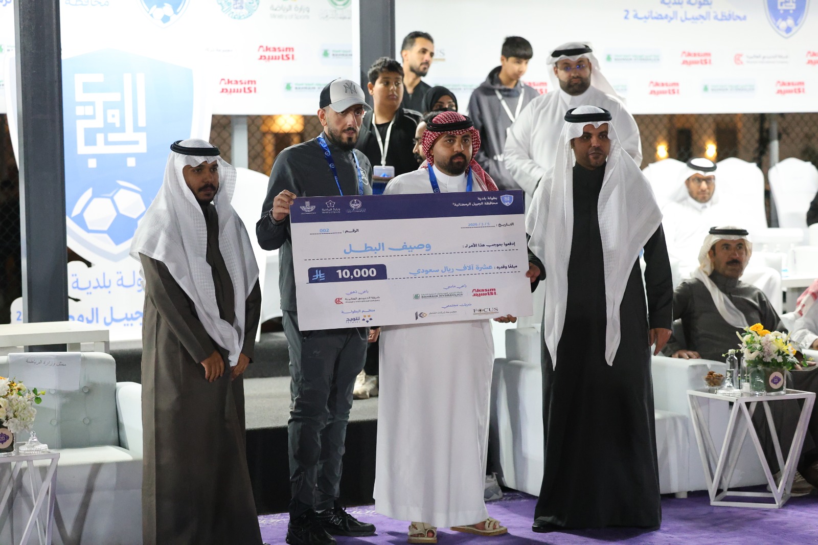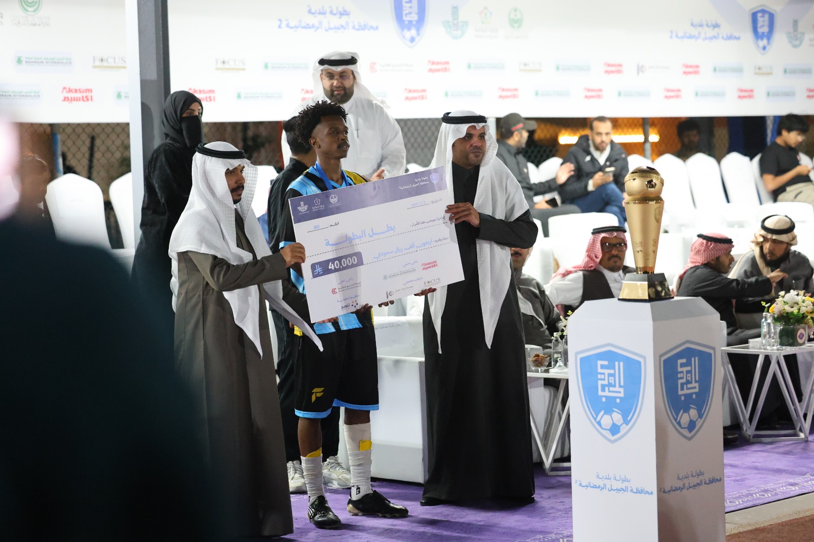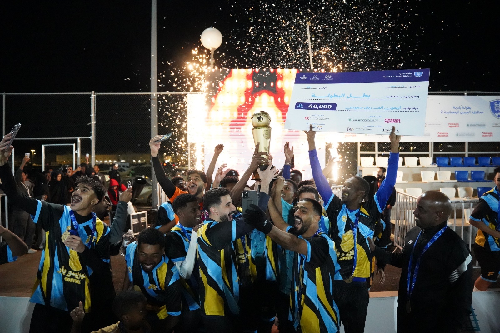 أكاديمية الفهد تتوج بطلاً لبطولة بلدية الجبيل الرمضانية الثانية بفوز مثير. حصلت الأكاديمية على الكأس وجائزة 40 ألف ريال، إثر تغلبها على فريق كوفي غبوق بركلات الترجيح (4 – 3) عقب تعادلهما 1 – 1. كوفي غبوق نال المركز الثاني وجائزة 10 آلاف ريال، في بطولة شهدت مشاركة نخبة فرق المنطقة الشرقية. تم تكريم الرعاة الماسيين مثل شركة أكاسيم وشركة البحرين للهيدروليك. بالإضافة إلى تكريم الراعي الذهبي وشركاء النجاح مثل شركة الخنيني العالمية. كما تم تسليم الجوائز الفردية للاعبين البارزين. فهد التركي حصل على لقب الهداف، سعد حماد كأفضل لاعب، بينما نال أسامة النجدي جائزة أفضل حارس. حفل رائع اختتمه أ. فيصل الحربي بالشكر لجميع الرعاة والداعمين.