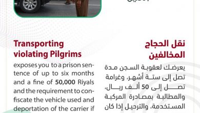 تغطيات – متابعات: حذر الأمن العام من نقل الحجاج المخالفين، حيث تصل الغرامة لـ 50 ألف ريال والترحيل ومصادرة المركبة.…