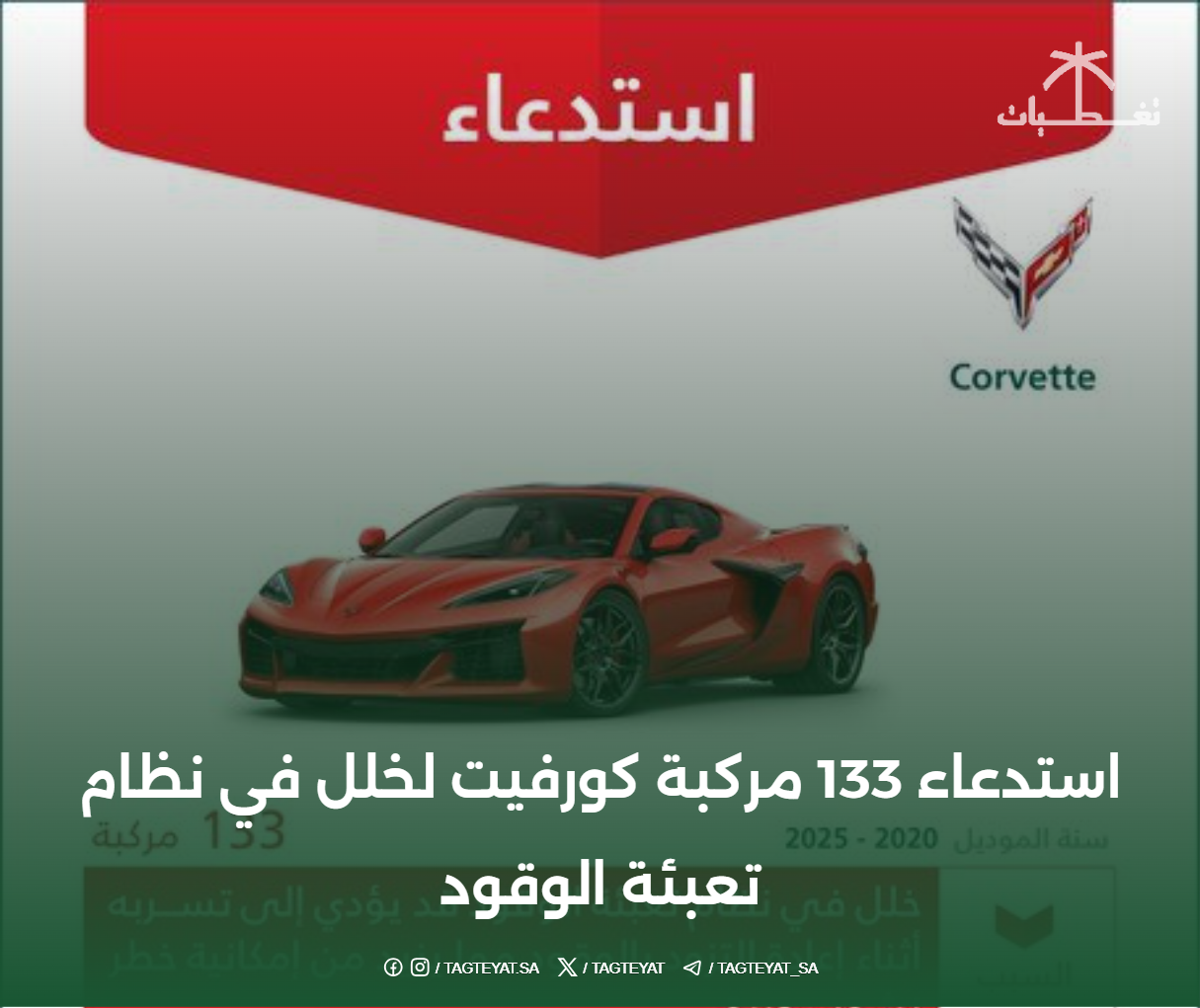 تغطيات – الرياض : أعلنت وزارة التجارة عن استدعاء 133 مركبة من طراز كورفيت (Corvette) من سنوات الطراز 2020 إلى…