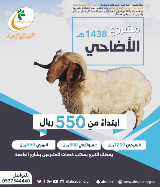 بر الأحساء تعلن عن الأسعار الموحدة للأضاحي وتبدأ باستقبال المتبرعين