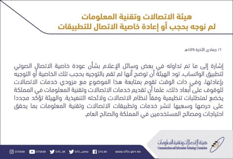 تغطيات – الرياض: نفت هيئة الاتصالات وتقنية المعلومات، توجيهها بحجب أو إعادة خاصية اتصال التطبيقات، ومن ذلك مكالمات تطبيق “واتس…