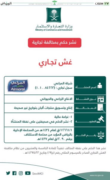 “التجارة” تنشر حكم “غش تجاري” بحق شركة المراعي