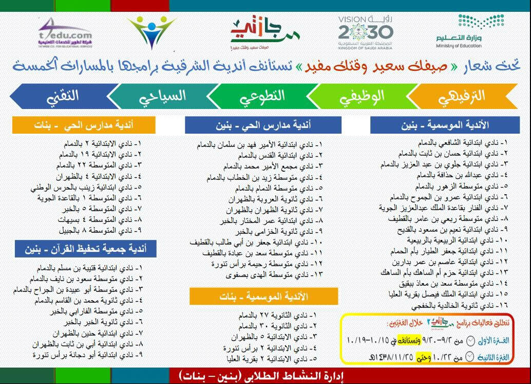 تغطيات – الدمام : تستأنف الأندية الموسمية وأندية الأحياء التابعة للإدارة العامة للتعليم بالمنطقة الشرقية ، في قطاعي البنين والبنات…