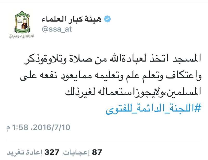 هيئة كبار العلماء: لا يجوز استعمال المسجد لغير الصلاة والعبادة