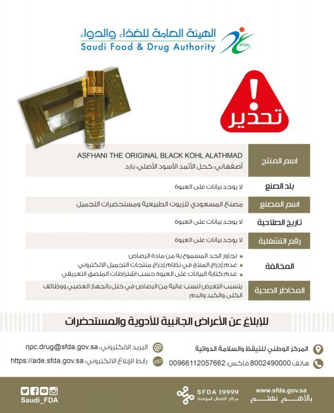 #الغذاء_والدواء تحذر من ثلاثة منتجات لكحل الأثمد لاحتوائها على نسبة عالية من الميكروبات والرصاص